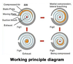 1.The air is sucked in from the suction port at the outside of the fixed scroll. The air enclosed in the confined space is compressed towards the center when the compression chamber is becoming smaller due to the rotation movement. The compressed space becomes smallest at the center, and the air compressed to the highest limit is discharged out from the central exhaust port. The movement Figure 1-4 (Suction-Compression-Exhaust) is repeated thereby to produce compressed air without pulsation.